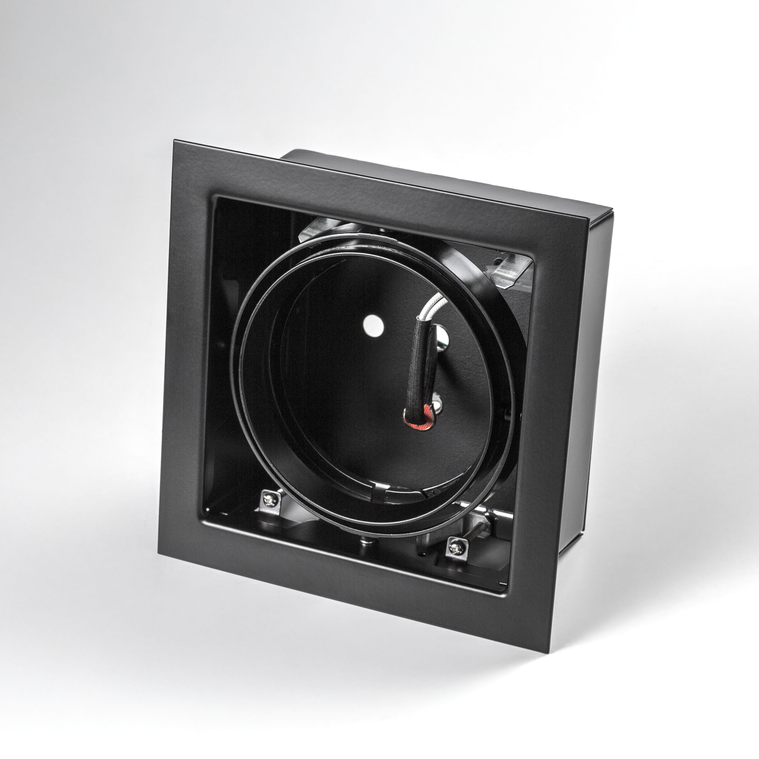 Врезное отверстие: 165x165 h100; Внешние габариты: 185x185 H5; Материал - основание/плафон: металл; Цвет-основание/плафон: черный; Лампа: 12 В DR111 max 50 Вт;
